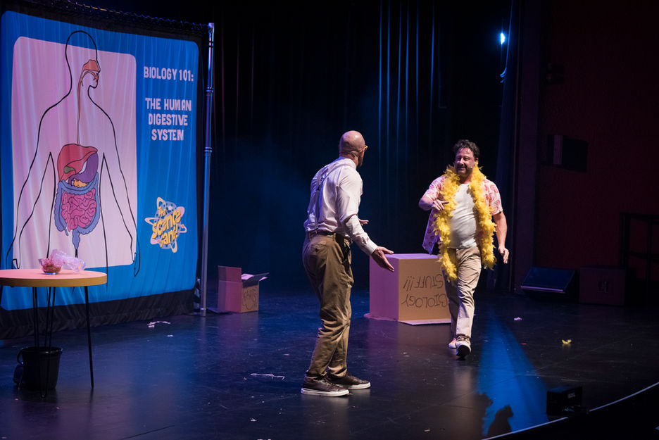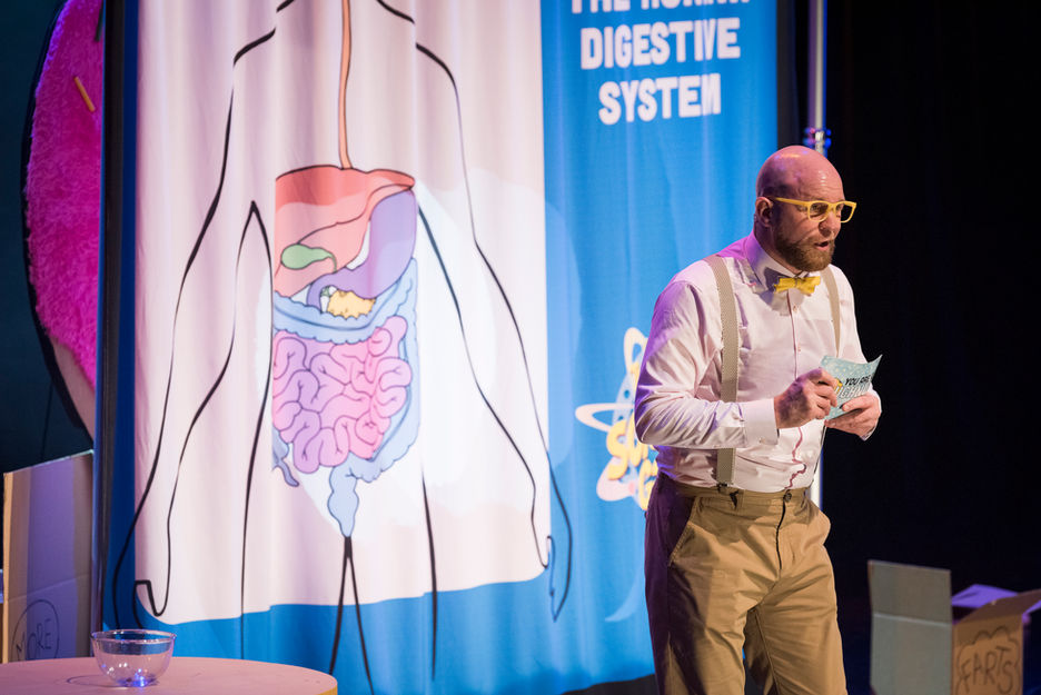 Join biology teachers Oesoph A. Gus and Dewey Dean as they embark upon an utterly brilliant all-singing, all-dancing (and all-clowning!) exploration of every twisting tube and remarkable organ — with sketches, songs, and sensational science.